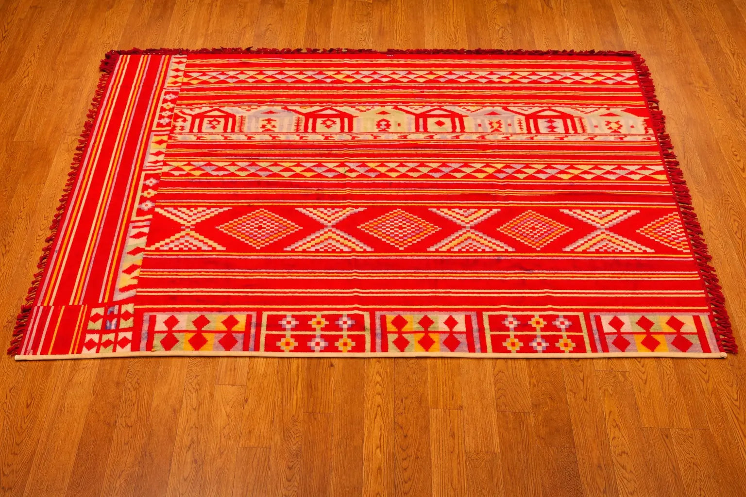Discover the Red Kilim, a handmade rug made with traditional craftsmanship. The fusion of vibrant colors and unique geometric patterns will bring a touch of elegance and warmth to your home. Made with quality materials, this rug will add a touch of culture and authenticity to your decor.